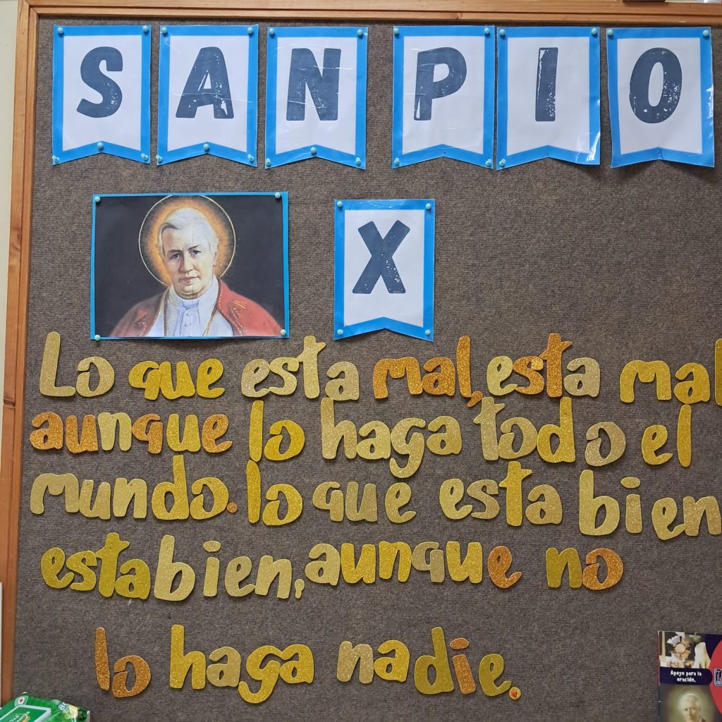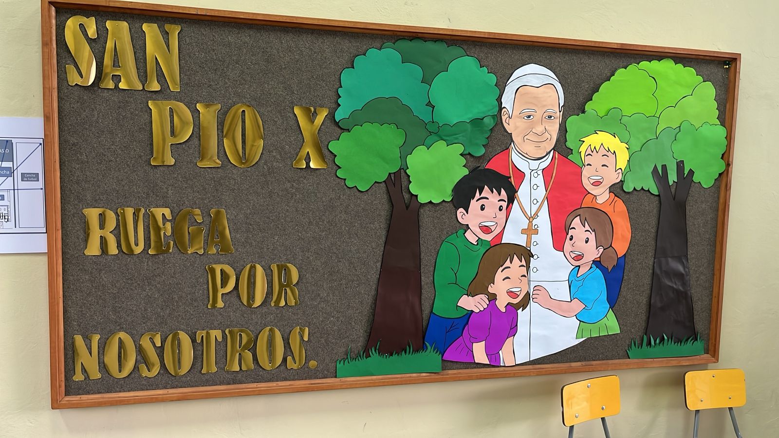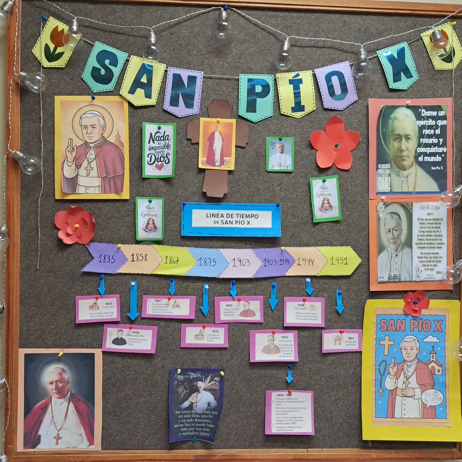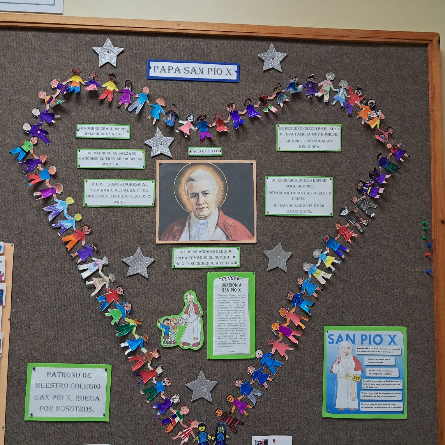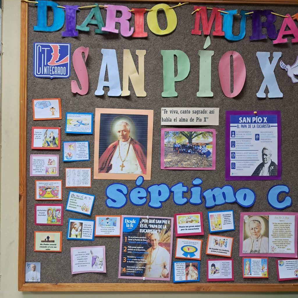 Por un lado, los diarios murales de nuestro colegio se han transformado en una verdadera galería de arte y fe gracias al tradicional concurso de diarios murales. Cada curso asumió el desafío de plasmar el ejemplo de vida de San Pío X. El resultado ha sido un despliegue de creatividad, donde los estudiantes han investigado y reflexionado sobre el mensaje trascendental del santo, conectando su ejemplo de vida con los desafíos y esperanzas de nuestra sociedad contemporánea.