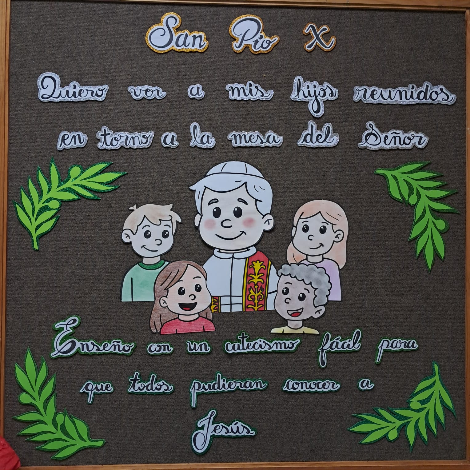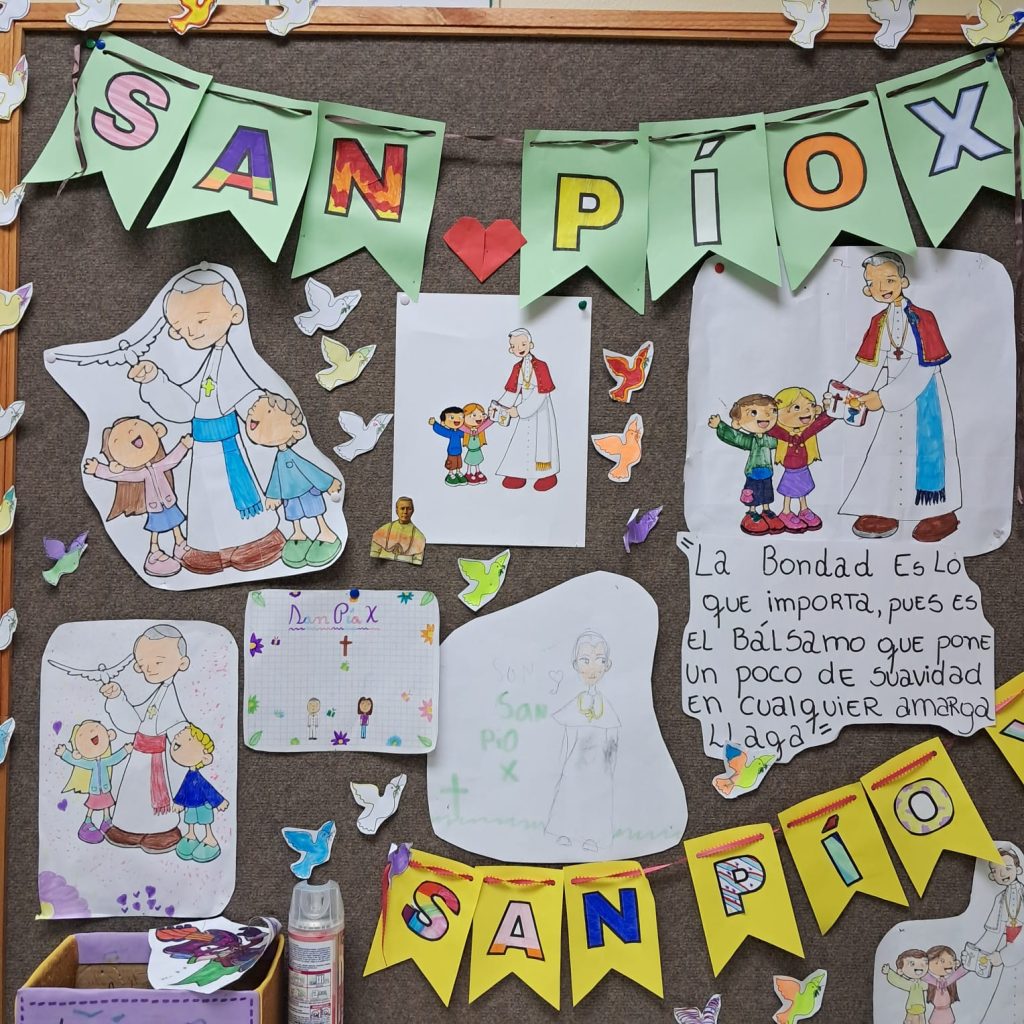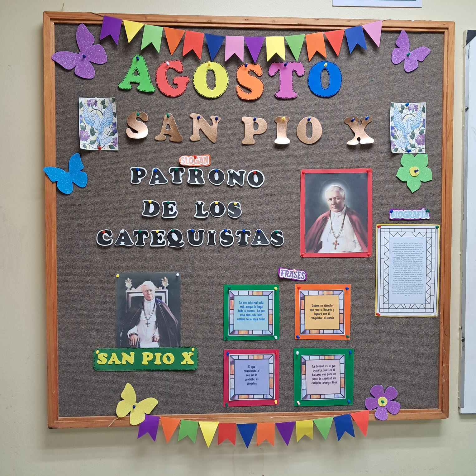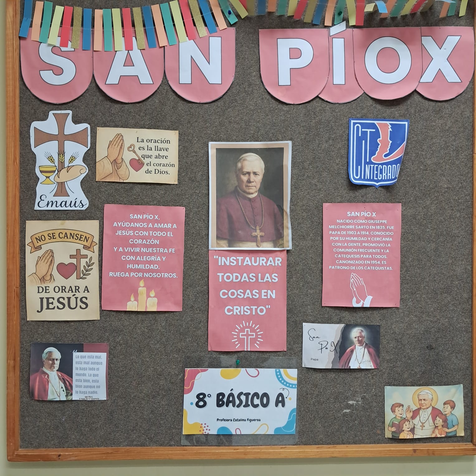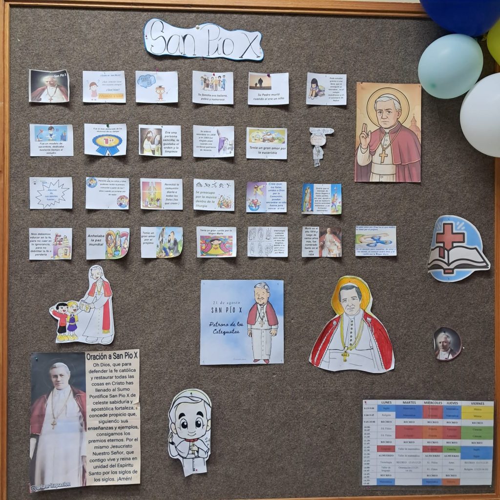 Por un lado, los diarios murales de nuestro colegio se han transformado en una verdadera galería de arte y fe gracias al tradicional concurso de diarios murales. Cada curso asumió el desafío de plasmar el ejemplo de vida de San Pío X. El resultado ha sido un despliegue de creatividad, donde los estudiantes han investigado y reflexionado sobre el mensaje trascendental del santo, conectando su ejemplo de vida con los desafíos y esperanzas de nuestra sociedad contemporánea.