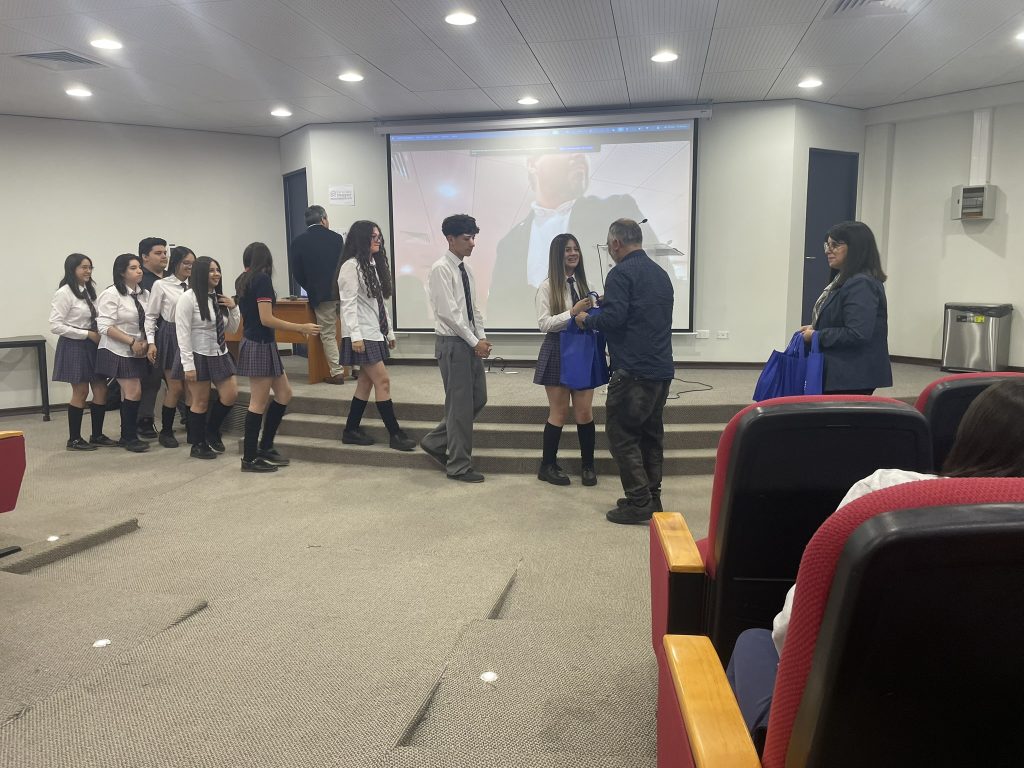 La actividad, que se desarrolló en el Auditorio F200A del Campus San Miguel, tuvo como eje central la temática «Proyectos escolares para la formación ciudadana». En este contexto universitario, un grupo de nueve estudiantes de II° Medio fue el encargado de representar a nuestra institución, subiendo al escenario para exponer su «Experiencia A+S» (Aprendizaje + Servicio).