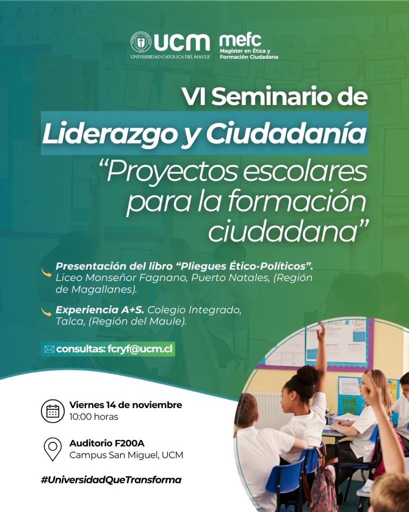 El pasado viernes 14 de noviembre, una delegación del Colegio Integrado tuvo una destacada participación en el VI Seminario de Liderazgo y Ciudadanía, encuentro académico organizado por el programa de Magíster en Ética y Formación Ciudadana de la Universidad Católica del Maule (UCM).